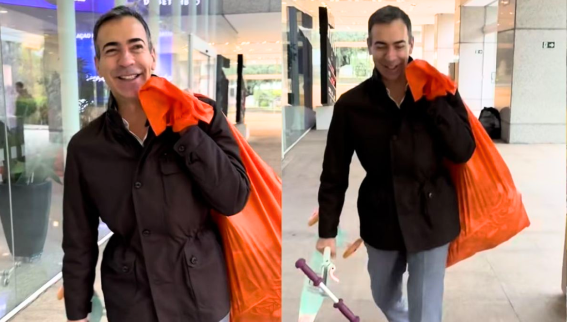 César Tralli, de 54 anos, levou um saco cheio de brinquedos da filha, Manuella, de 6 anos, para doar aos colegas da TV Globo. No Instagram, o apresentador do Jornal Hoje contou que faz isso desde jovem e que gosta de “fazer a energia boa circular”.